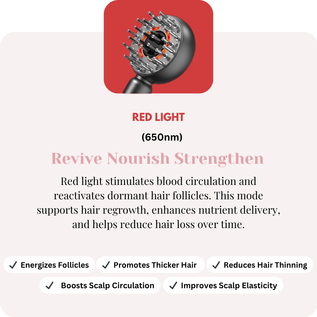 Red Light Mode: Stimulates hair follicles and promotes regrowth while improving circulation.