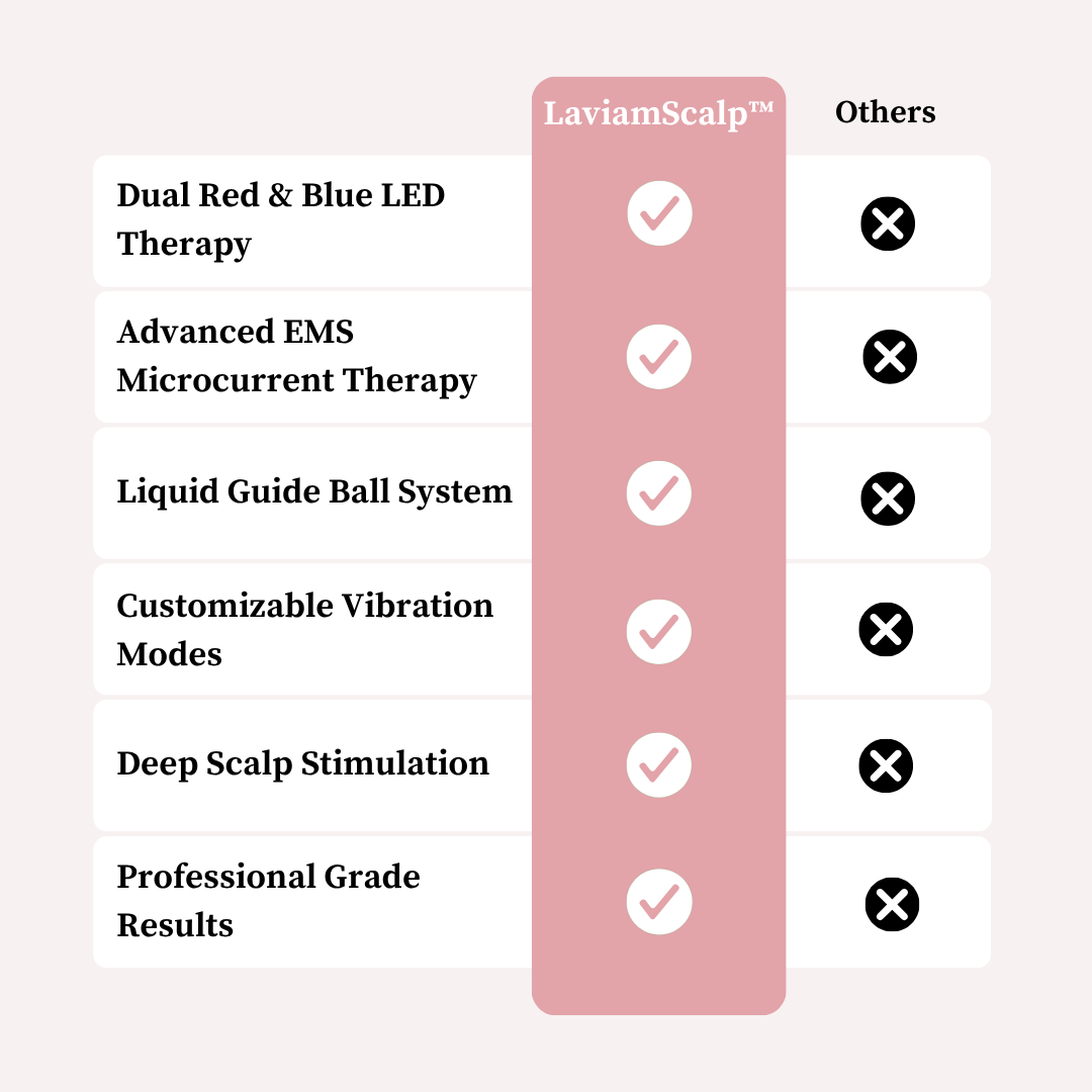 The LaviamScalp™ is expertly designed to support a wide range of hair and scalp concerns. Its combination of LED light therapy, EMS microcurrent, and soothing vibrations improves nutrient absorption, stimulates hair follicles, and promotes overall scalp health.
