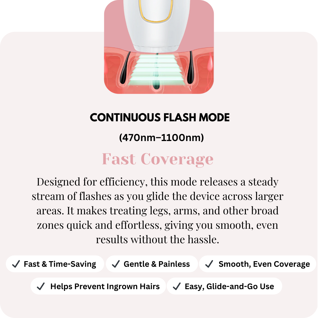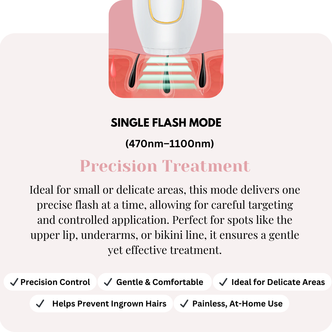 Two Flash Modes: Single Flash for small, precise areas like the face or underarms, and Continuous Flash for faster coverage on larger areas such as legs or arms.