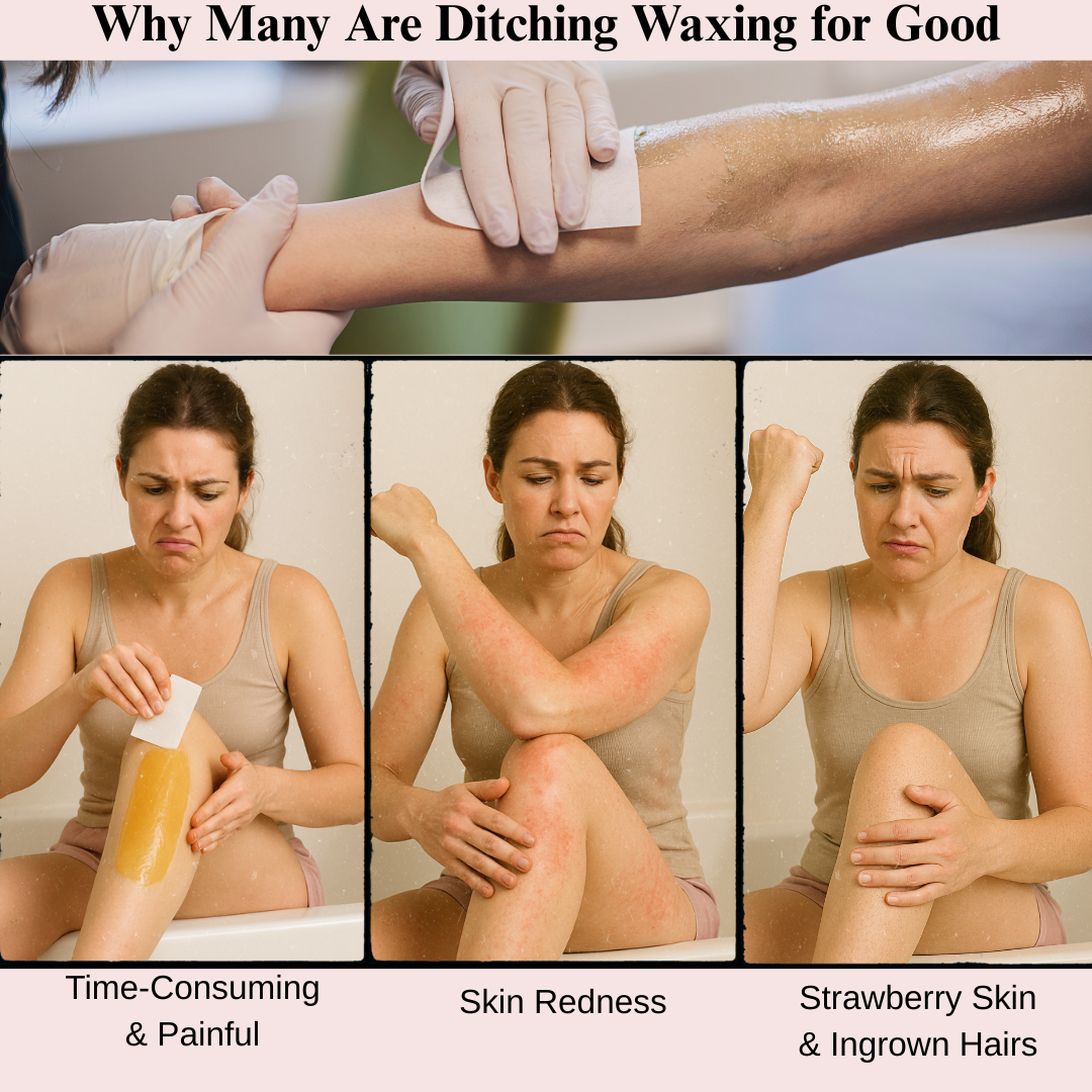 Waxing can be messy, painful, and harsh on your skin — often leaving redness, bumps, or ingrown hairs behind. It takes time, requires constant upkeep, and can get expensive with repeated salon visits.