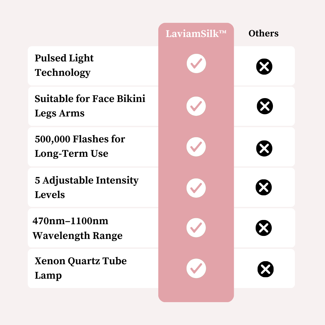 LaviamSilk™ uses Intense Pulsed Light (IPL), a safe and proven cosmetic technology trusted for at-home hair reduction.