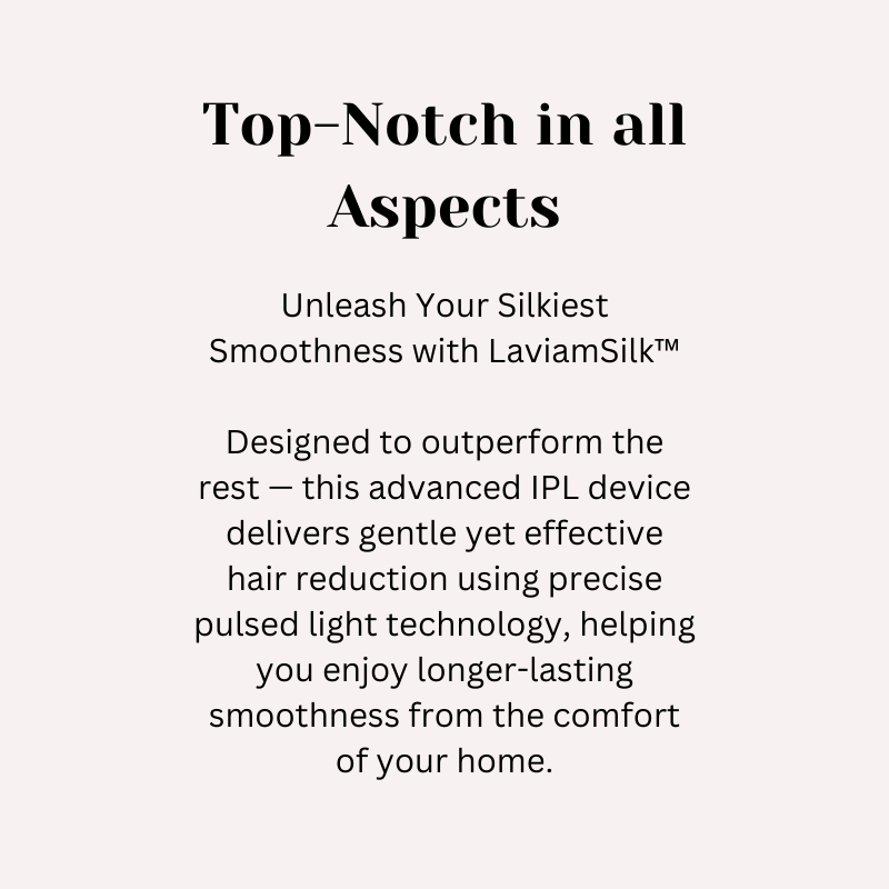 LaviamSilk™ is an at-home IPL (Intense Pulsed Light) hair removal device designed for cosmetic use. It works by targeting hair at the root with gentle pulses of light, helping you achieve smoother-looking skin over time — without the pain or mess of waxing and shaving.