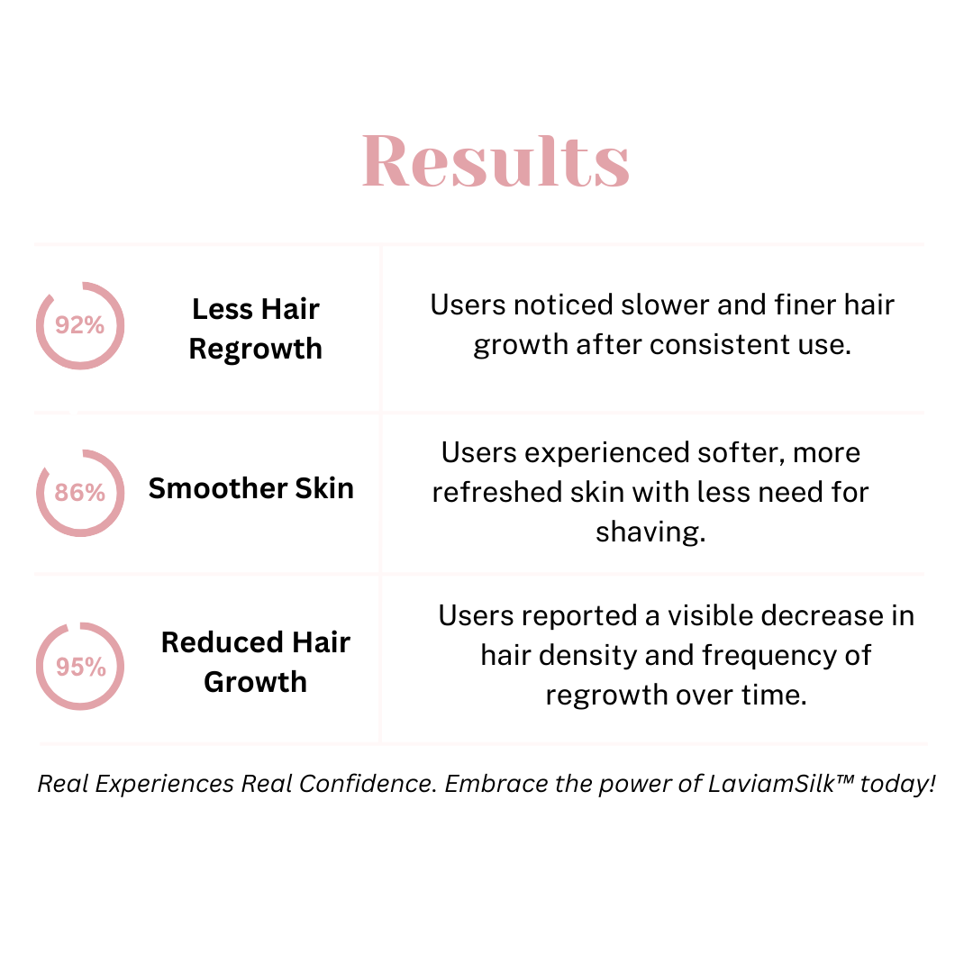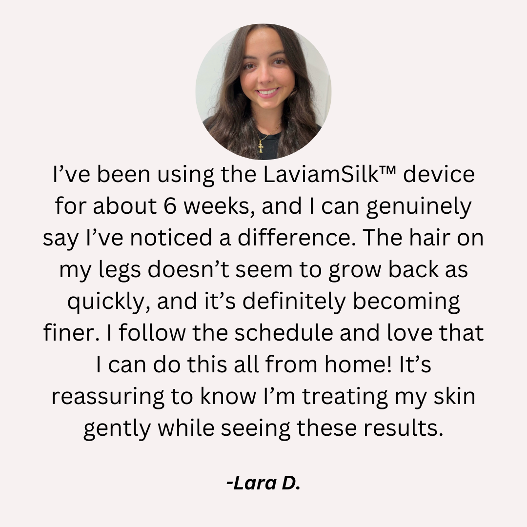 With consistent use, LaviamSilk™ provides a gentle, at-home option for smoother-looking skin — without the hassle of waxing or shaving.
