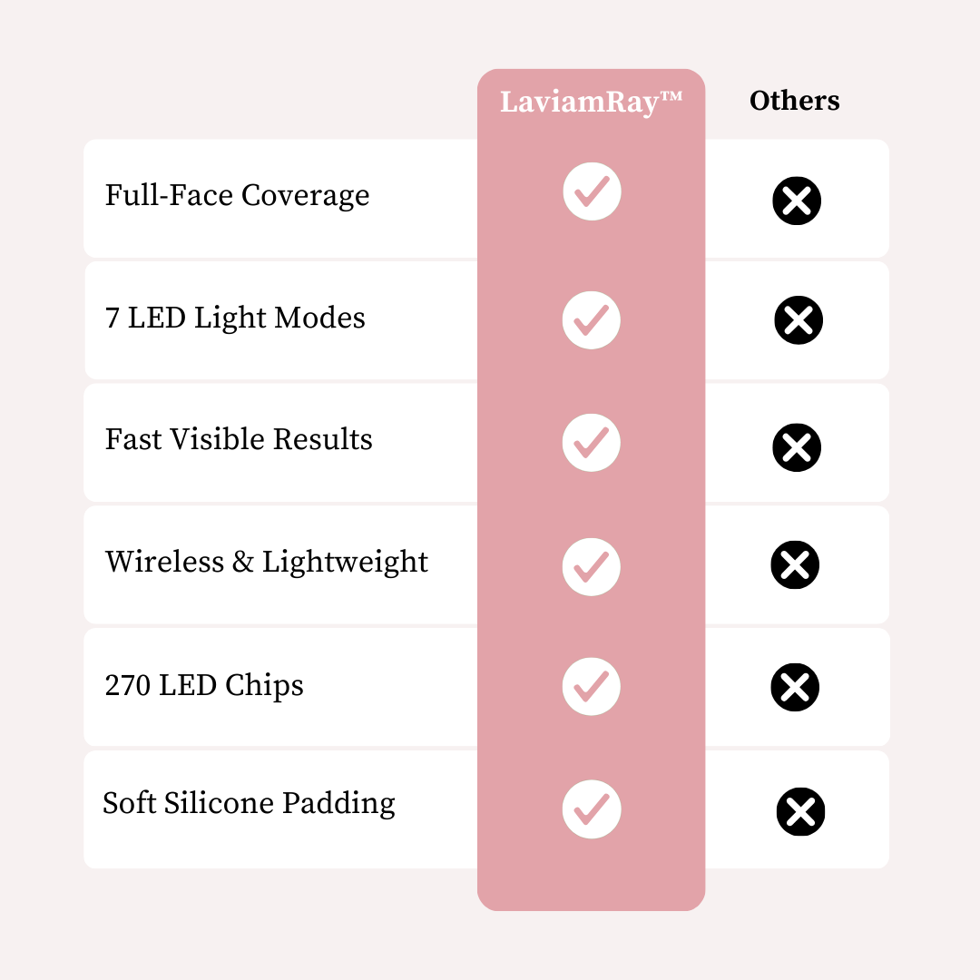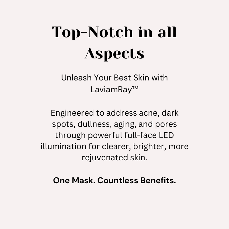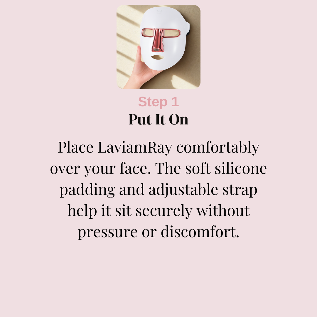 LaviamRay™ is an at-home LED light therapy face mask designed to help reduce the appearance of wrinkles, improve uneven tone, calm breakouts, and refine skin texture. It uses 7 targeted LED wavelengths, each designed to interact with the skin at different depths to support collagen activity, cellular renewal, and overall skin clarity.