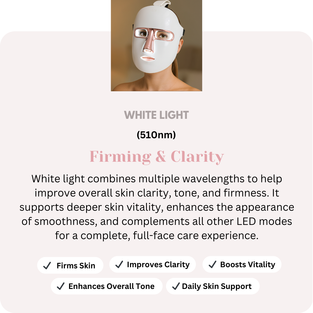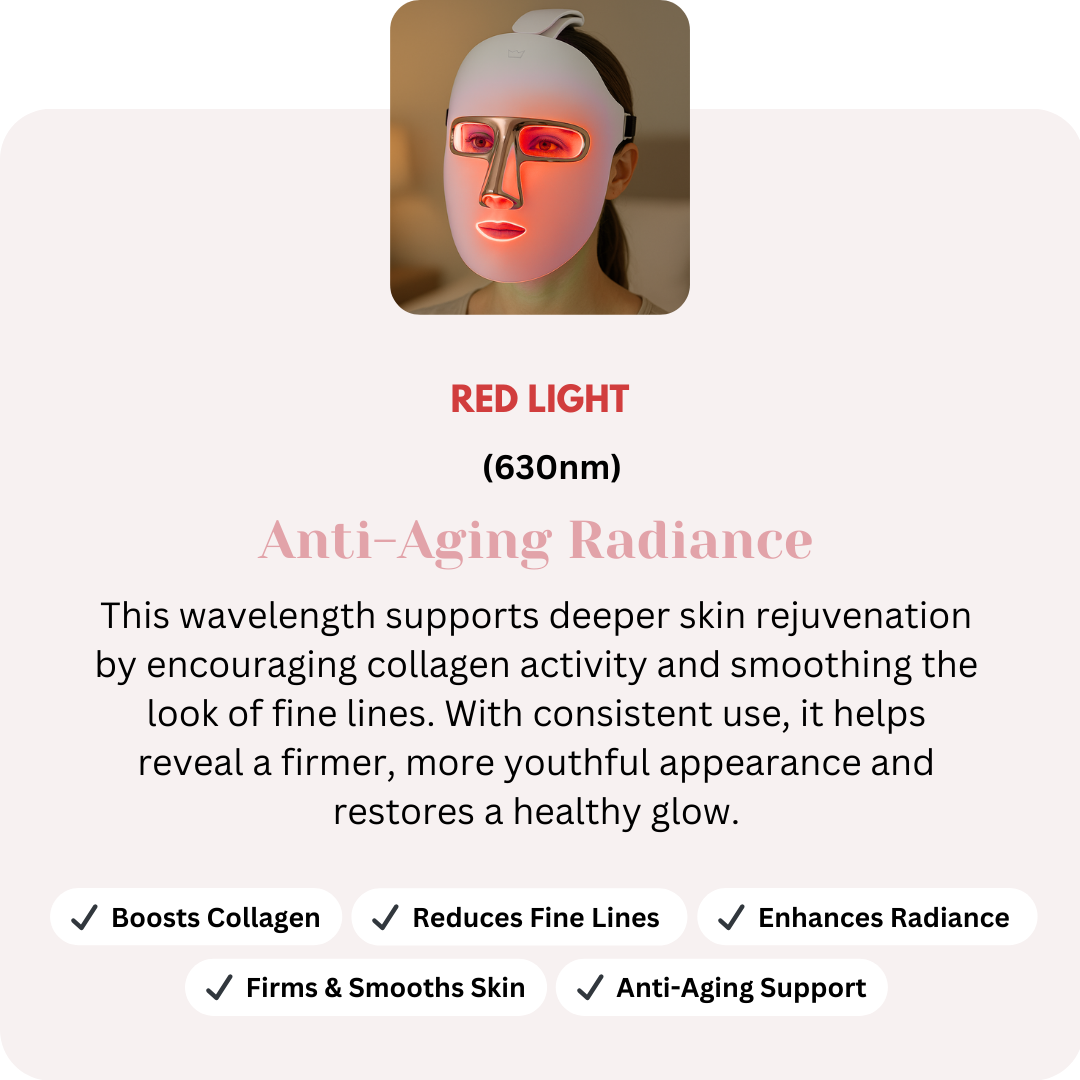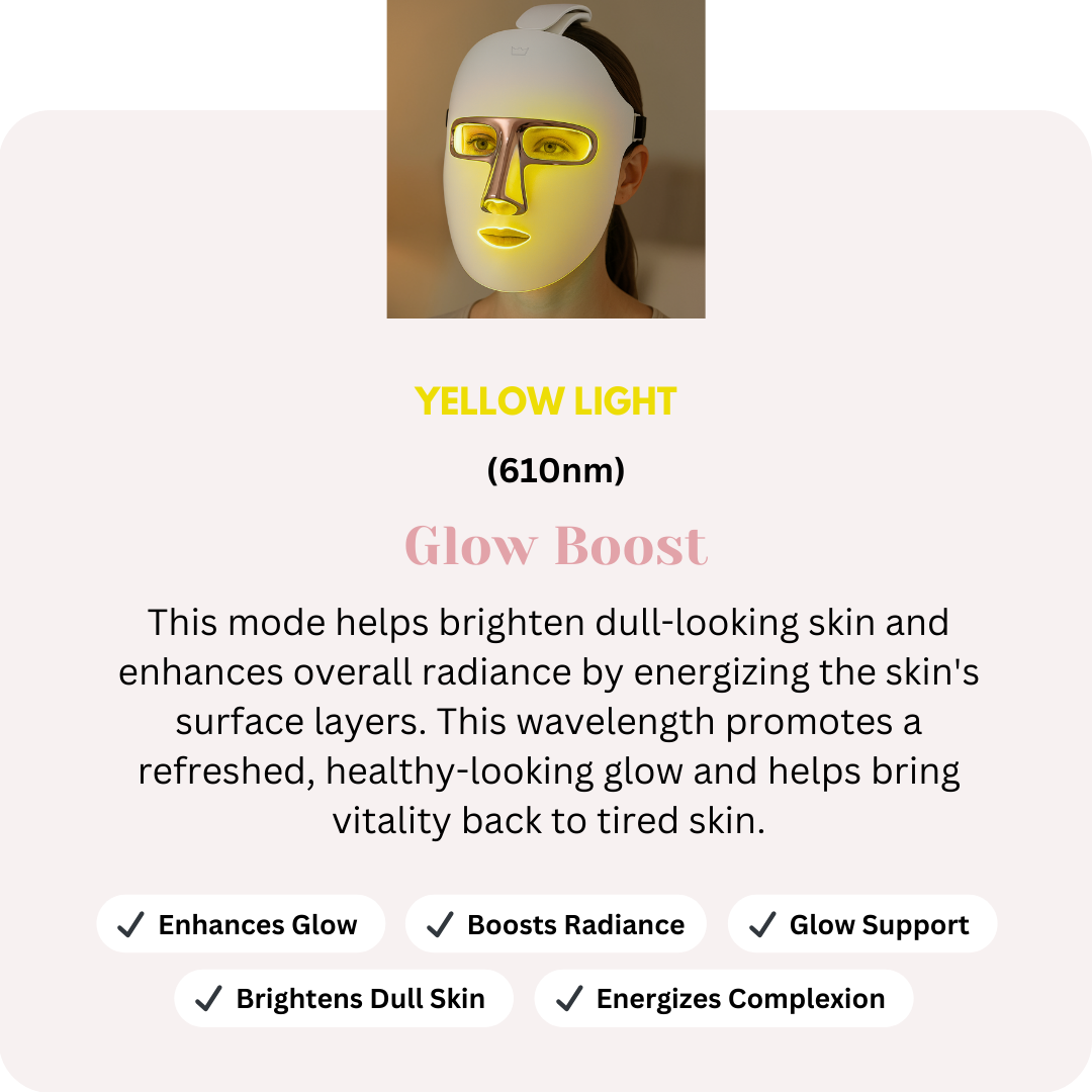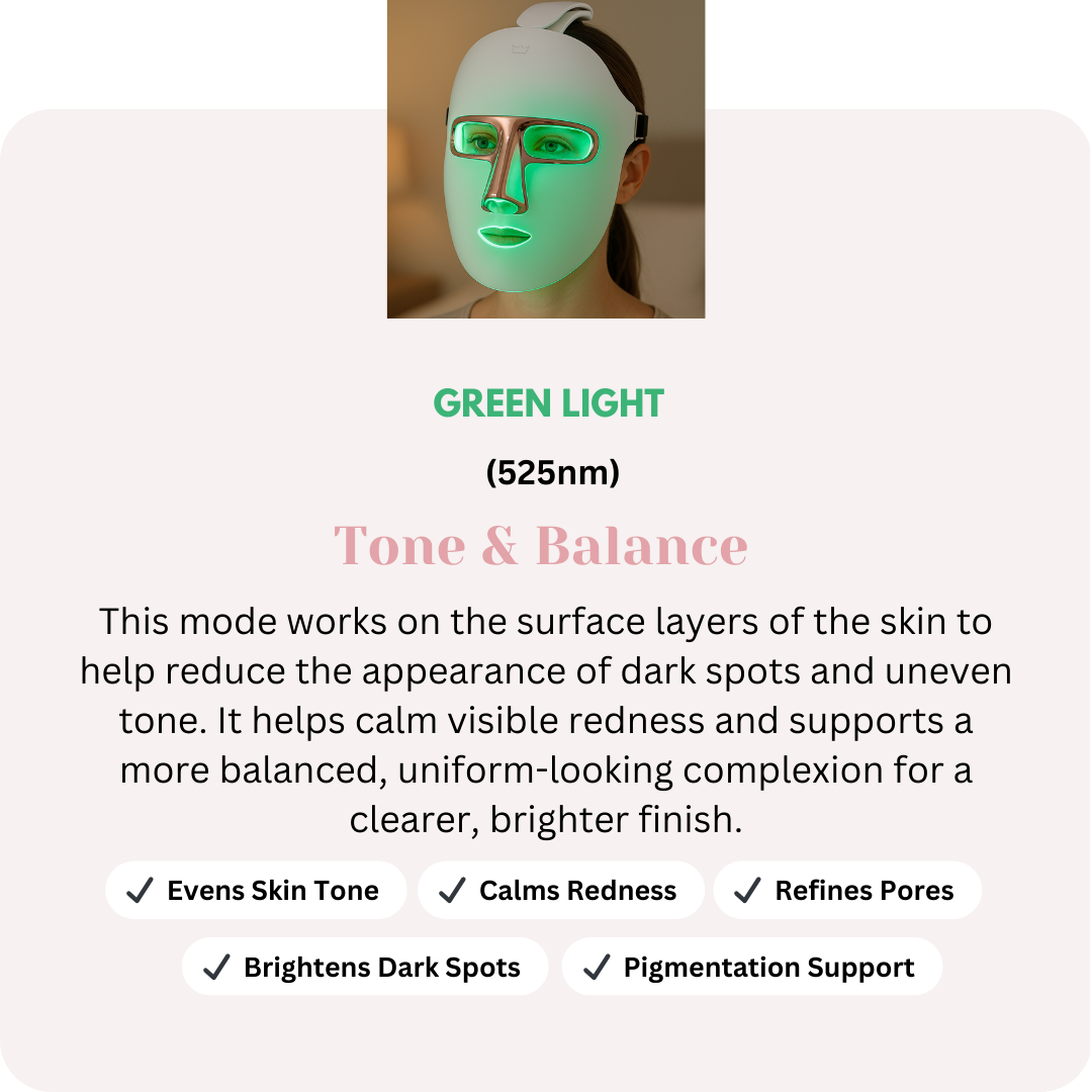 Each LED mode targets specific skin concerns — supporting collagen, improving the look of pigmentation, and calming inflammation for balanced, radiant skin.