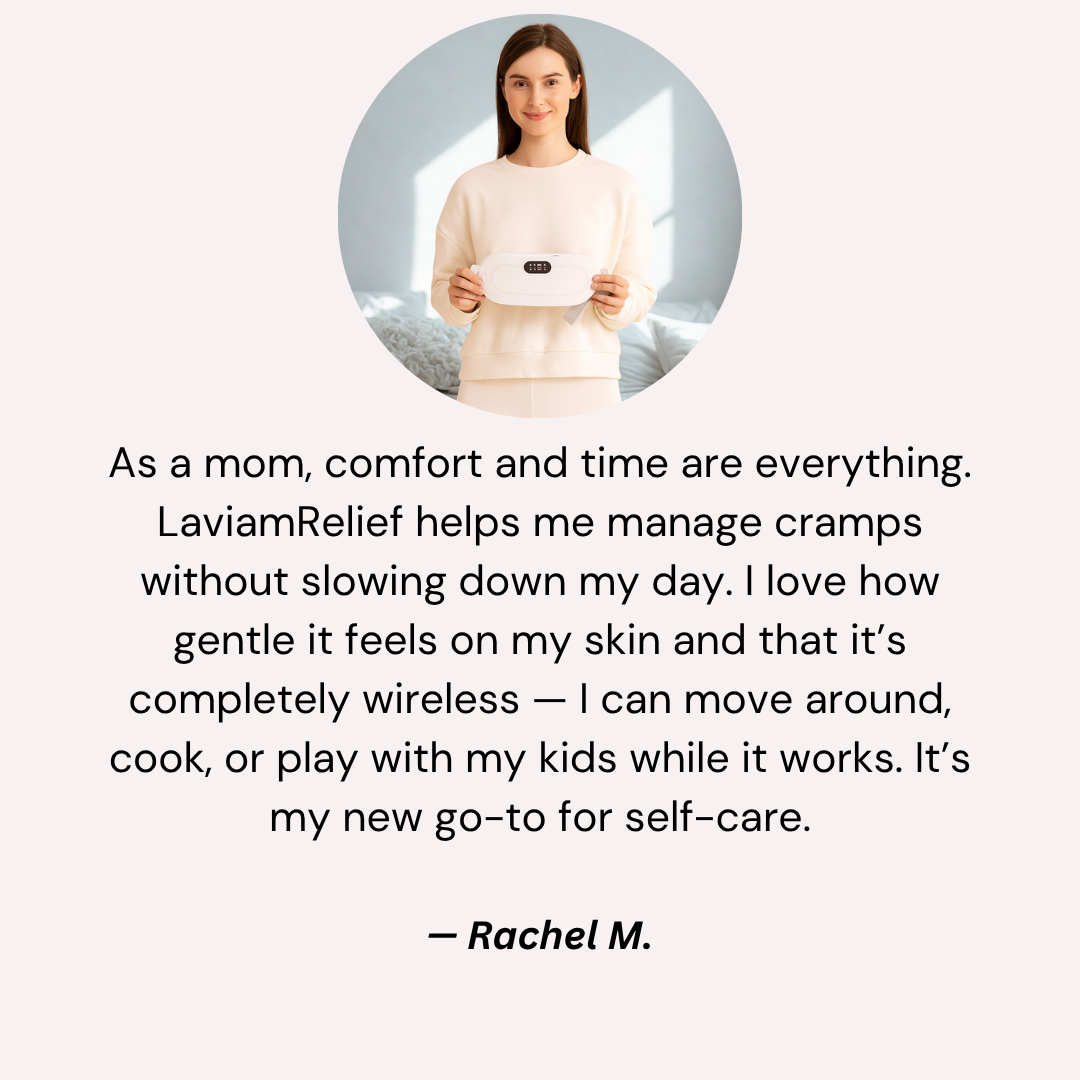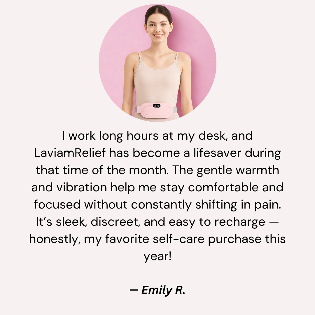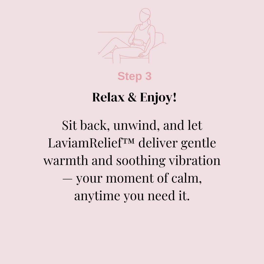 LaviamRelief™ delivers steady warmth and gentle vibration — no cords, no holding, no mess.