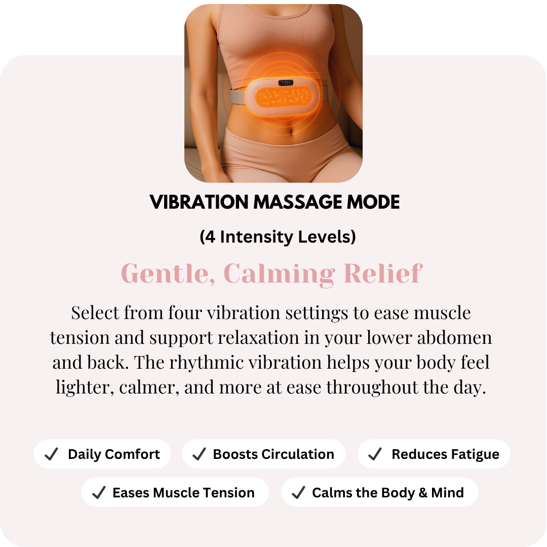 Its combination of gentle heat and soothing vibration therapy helps ease menstrual cramps, lower-back tension, and muscle discomfort, while supporting healthy blood flow for a calm, balanced feeling throughout your cycle.